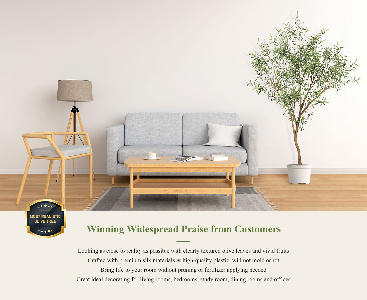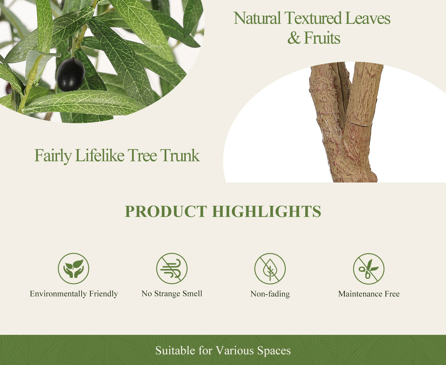 The Artificial Olive Tree has been painstakingly crafted to mimic the appearance of an olive tree, as close to the real thing as possible. The single trunk splits into multiple stems adorned with dozens of olive fruits and is made of rubberized silk fabric. The textured olive leaves and vibrant colors make this fake tree a timeless seasonal home decoration that will definitely make you feel like nature.