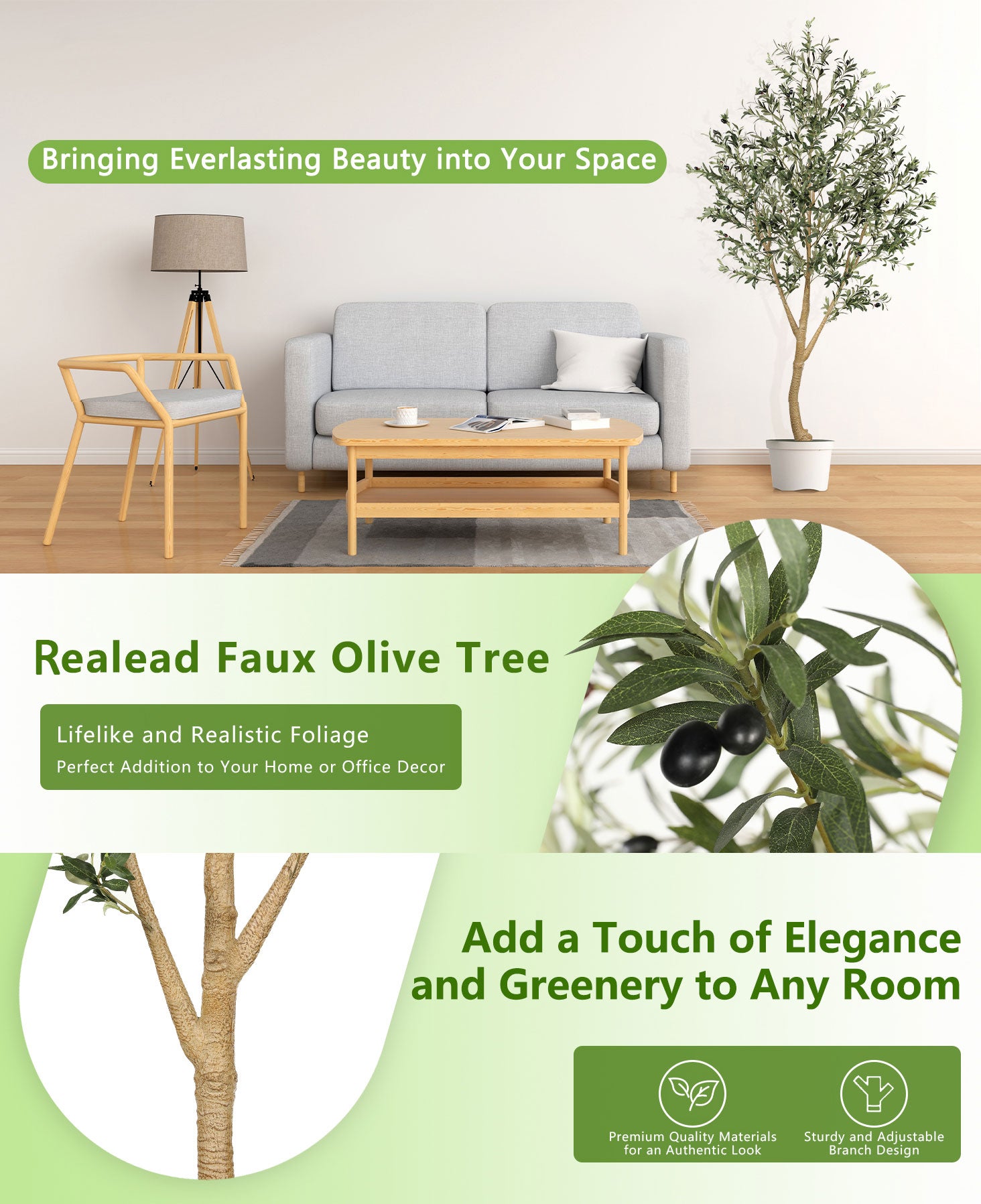 The Artificial Olive Tree has been painstakingly crafted to mimic the appearance of an olive tree, as close to the real thing as possible. The single trunk splits into multiple stems adorned with dozens of olive fruits and is made of rubberized silk fabric. The textured olive leaves and vibrant colors make this fake tree a timeless seasonal home decoration that will definitely make you feel like nature.