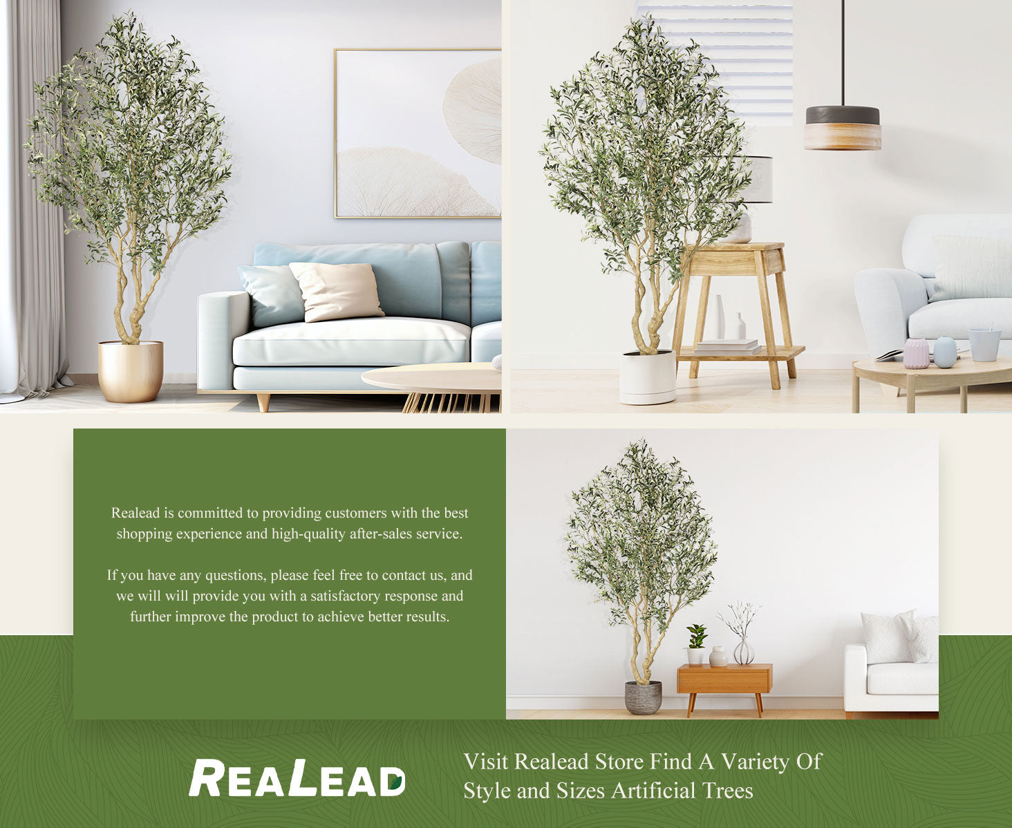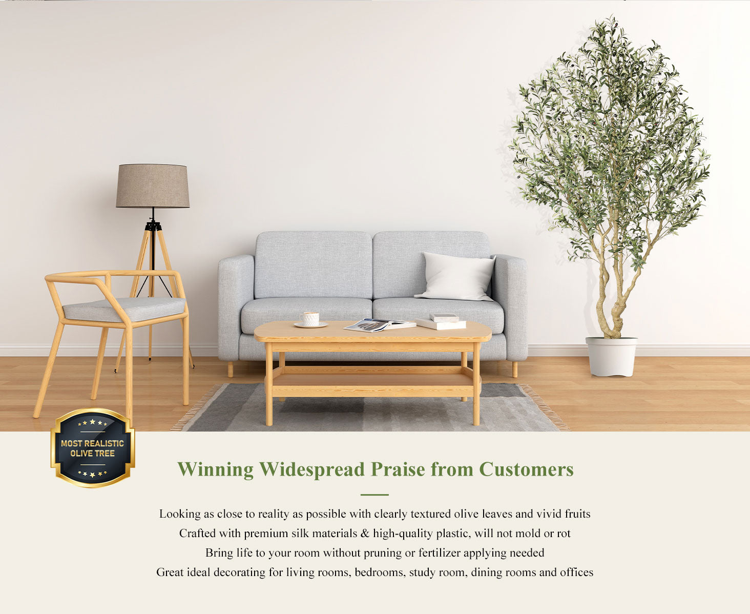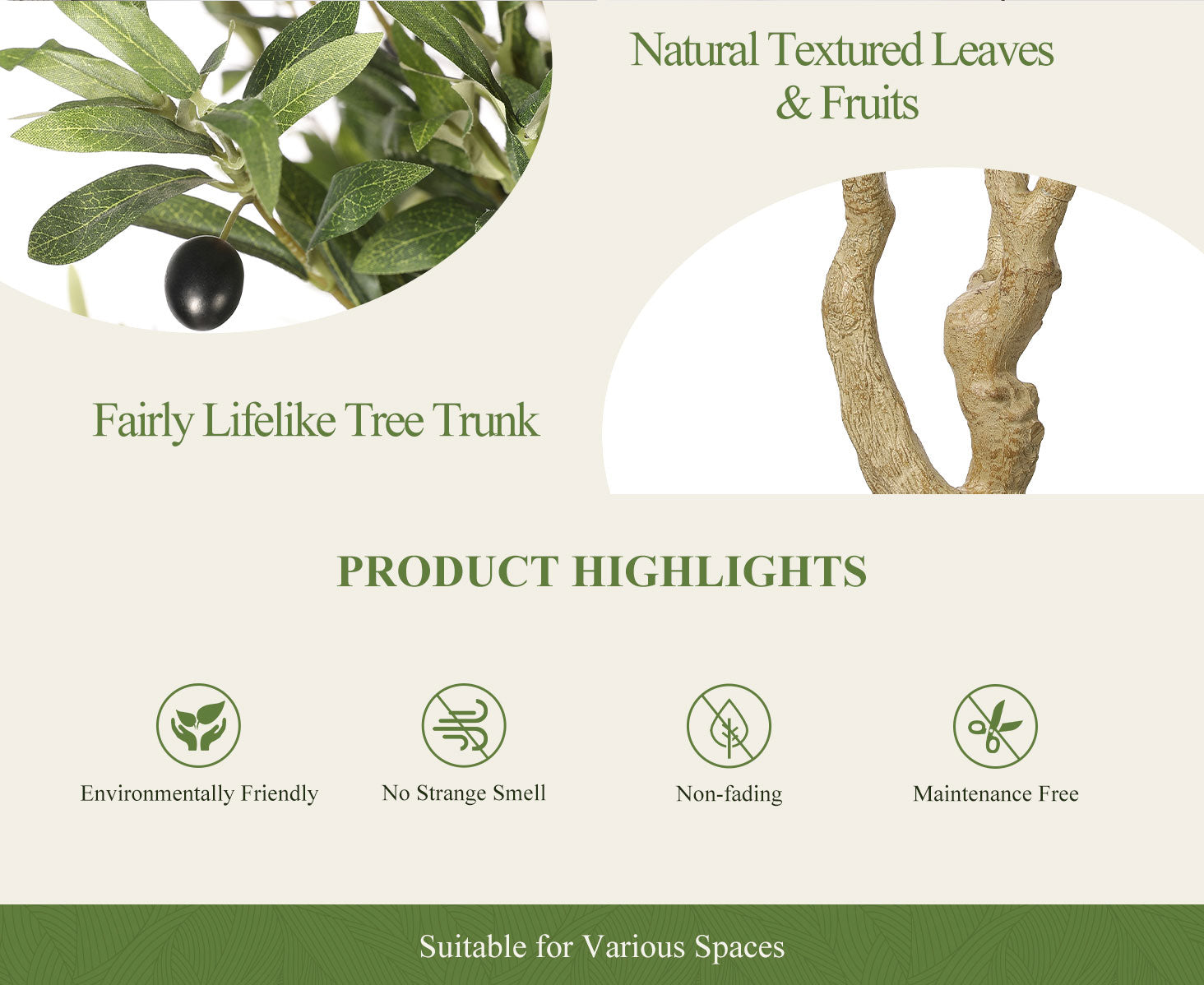 The Artificial Olive Tree has been painstakingly crafted to mimic the appearance of an olive tree, as close to the real thing as possible. The single trunk splits into multiple stems adorned with dozens of olive fruits and is made of rubberized silk fabric. The textured olive leaves and vibrant colors make this fake tree a timeless seasonal home decoration that will definitely make you feel like nature.
